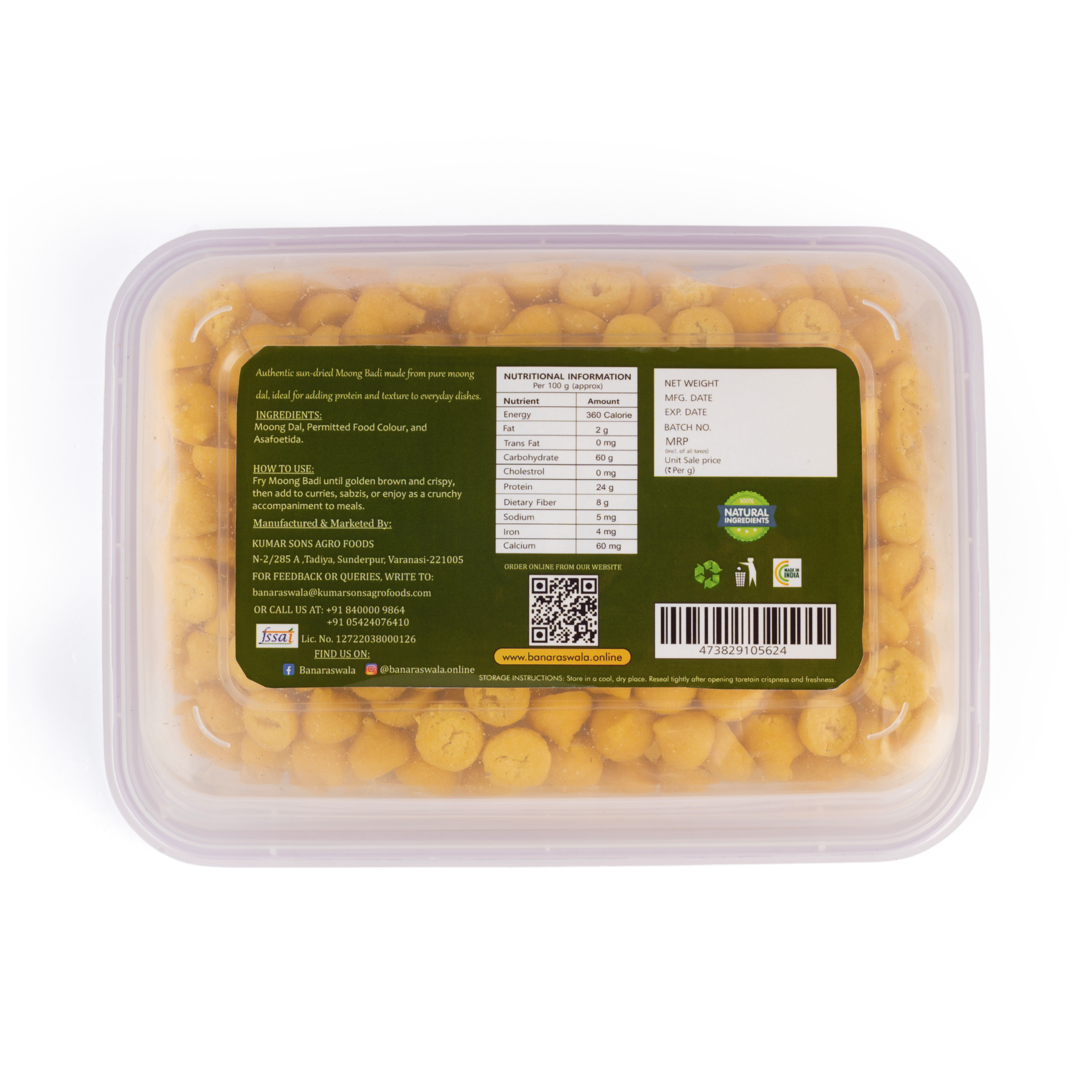 Deliciously crunchy and packed with flavor, our Moong Badi is made from premium moong dal and seasoned with traditional spices. These small, golden nuggets are perfect as a crispy snack, or you can add them to curries and stews for extra texture and taste. A true delight for every food lover!