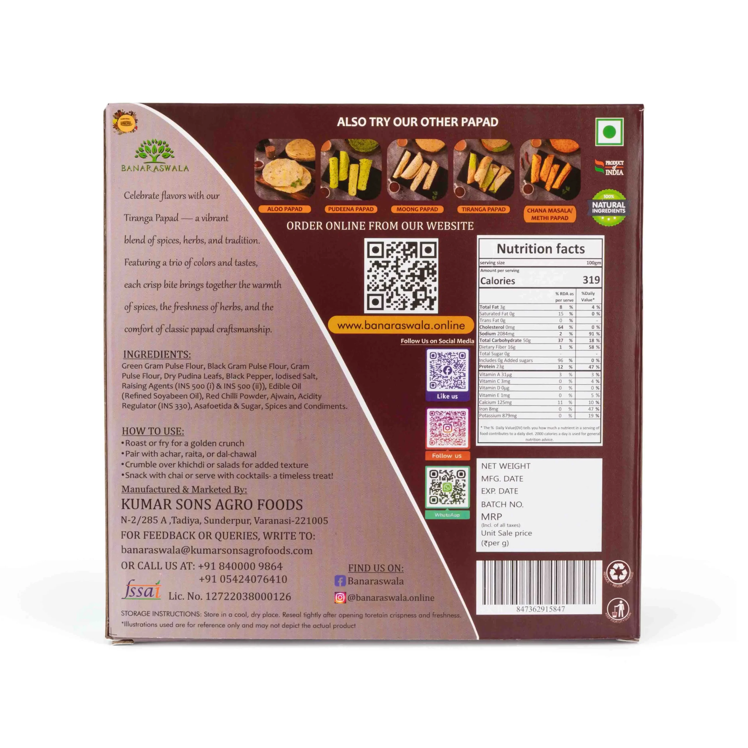 A colorful celebration of taste and tradition! Our Tiranga Papad features three vibrant layers—spicy red, herby green, and classic white—each made with a unique blend of spices and lentil flours. Crispy, flavorful, and visually striking, it’s perfect for festive occasions or anytime you want to add some flair to your plate.
