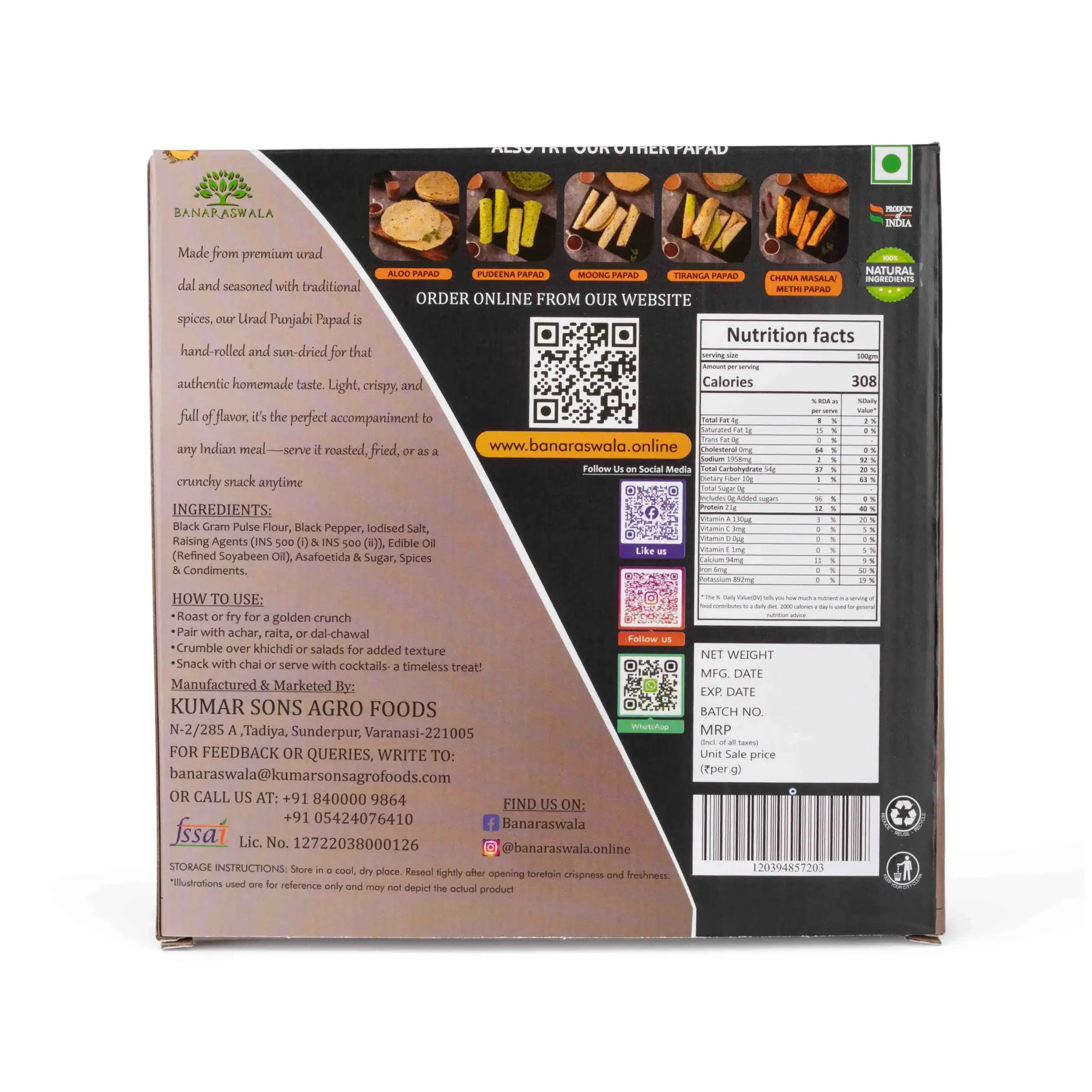 Authentic taste with a Punjabi punch! Our Moong Punjabi Papad is made from premium moong dal flour and seasoned with a bold blend of traditional Punjabi spices. Thin, crisp, and full of flavor, it’s perfect when roasted or fried—an ideal companion to any meal or a spicy snack on the go.